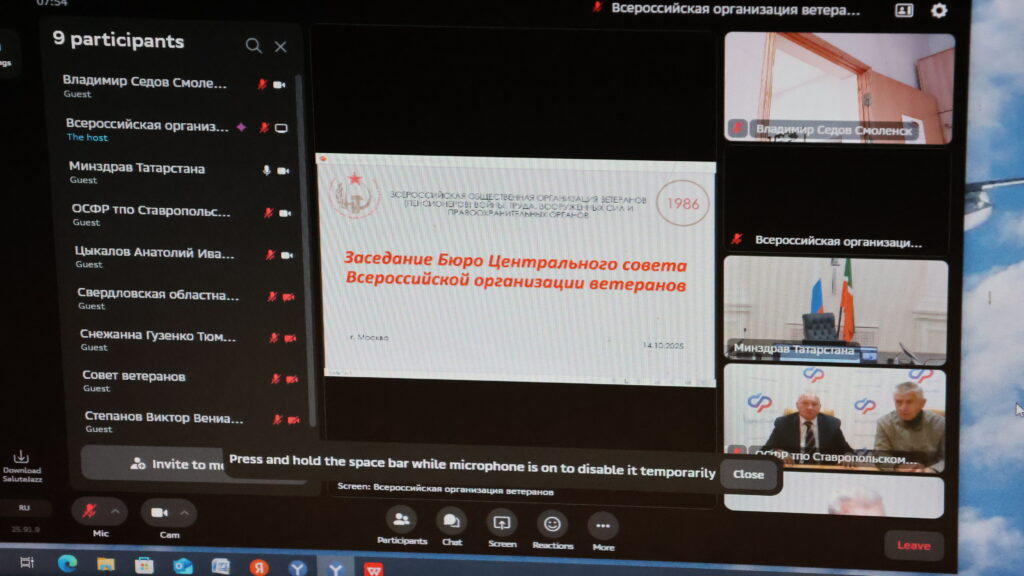 Председатель Смоленского областного Совета ветеранов Виталий Владимирович Вовченко принял участие в заседании Бюро Центрального совета Всероссийской организации ветеранов 14 октября 2025 года в режиме ВКС.